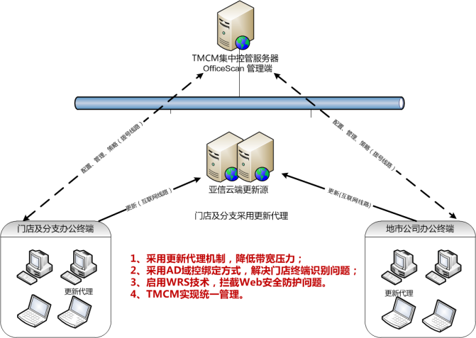304am永利集团终端安全解决方案(OfficeScan + TMCM),有效地解决了连锁企业这种分散式终端的安全管理难题。